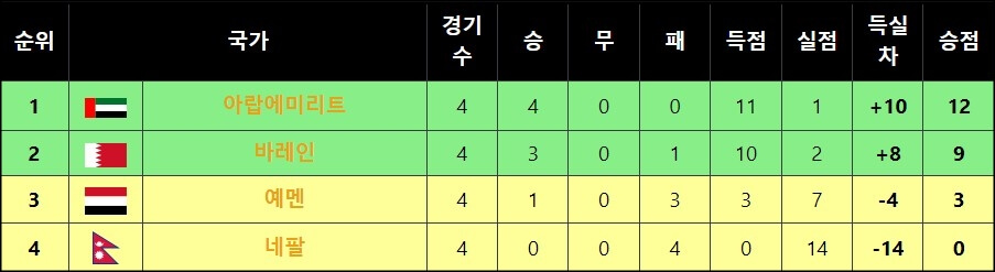 아랍에미리트, 바레인, 예멘, 네팔이 속해있는 H조에서는 승점 12점을 달리고 있는 아랍에미리트가 조 1위와 동시에 월드컵 3차 예선 진출과 아시안컵 본선 진출을 확정했는데요~ 네팔이 바레인과의 4차전 경기에서 3대 0으로 패배하는 바람에 3차 예선 진출에 실패했고, 바레인이 예멘과 승점차를 6점으로 벌리면서 조 2위에 안착했어요. 그리고 5차전인 바레인과 예멘의 경기에서 바레인이 지지만 않는다면 3차 예선에 진출할 것으로 보고 있어요.