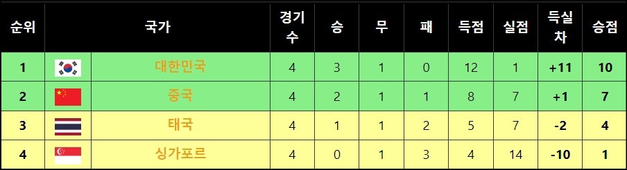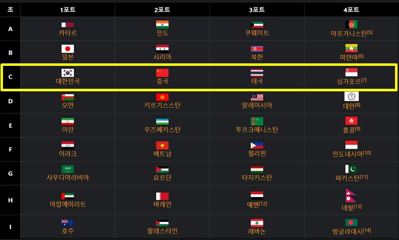 한국, 중국, 태국, 싱가포르가 속해있는 C조는 승점 10점을 가지고있는 한국이 1위에 올라있는데요~ 앞서 말했듯이 각 조 1~2위가 3차 예선에 오르기 때문에 한국이 태국보다 승점 6점을 앞서고 있어 싱가포르와의 5차전 경기에서 비기기만 해도 3차 예선 진출을 확정할 수 있어요. 그리고 혹시나 싱가포르에게 지더라도 태국이 승점을 획득하지 못하게 되면 이때도 한국은 3차 예선 진출을 확정하게 돼요.