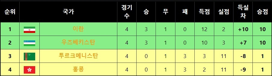 이란, 우즈베키스탄, 투르크메니스탄, 홍콩이 속해있는 E조에서는 승점 10점에 득실차까지 앞서고 있는 이란이 1위에 올라있는데요~ 사실 E조에서는 이미 투르크메니스탄과 홍콩의 탈락이 확정되면서 이란과 우즈베키스탄이 월드컵 3차 예선 진출과 동시에 아시안컵 본선 진출까지 확정했어요. 그렇게 월드컵 본선 진출에 탈락한 투르크메니스탄과 홍콩은 아시안컵 3차 예선에 진출합니다.
