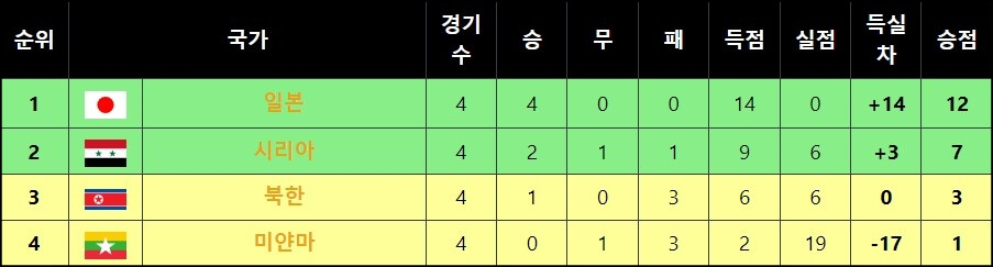 일본, 시리아, 북한, 미얀마가 속해있는 B조에서는 승점 12점을 가지고있는 일본이 1위에 올라있으며 일본도 카타르와 마찬가지로 월드컵 3차 예선 진출과 아시안컵 본선 진출까지 확정했는데요~ 일본은 북한이 4차전 경기에서 경기를 취소하면서 몰수패가 선언된 덕분에 최소 조 2위를 확보하면서 가장 먼저 3차 예선 진출을 확정한 국가가 되었기도 해요. 대체 무슨 복인지^^;::
