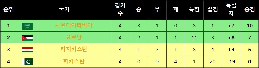 개최국인 사우디 아라비아 요르단, 타지키스탄, 파키스탄이 속해있는 G조에서는 승점 10점을 올린 사우디아라비아가 1위에 올라있는데요~ 파키스탄은 요르단과의 4차전 경기에서 7대 0으로 패배하면서 3차 예선 진출 실패가 확정되었고, 앞으로있을 파키스탄과 사우디 아라비아 경기에서 사우디는 비기기만 해도 3차 예선 진출을 확정할 수 있어요. 그리고 6월 7일에 있을 요르단과 타지키스탄의 경기 결과에 따라서 조 2위가 정해지며 하나 남은 3차 예선 진출 국가도 확정되겠죠~