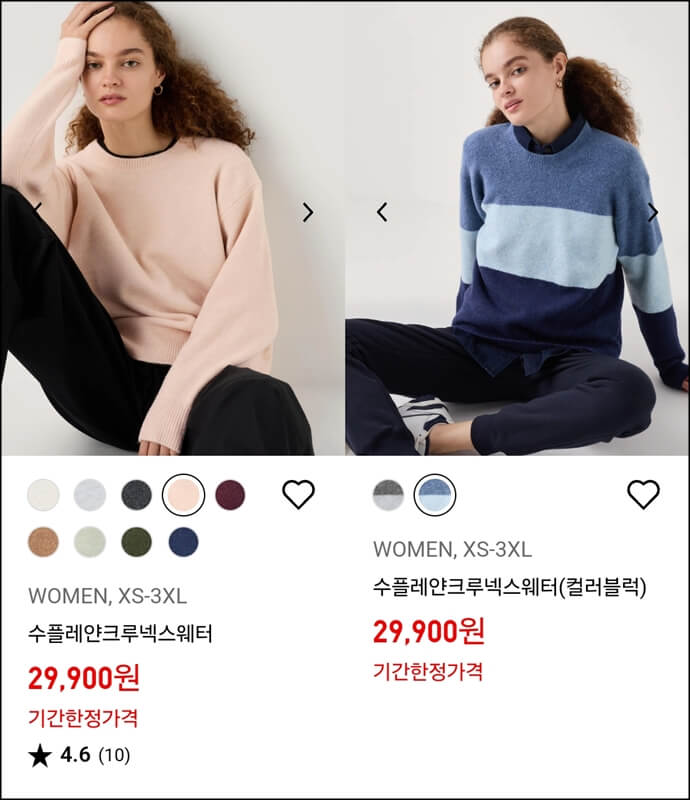 원래라면 유니클로에서 나오는 스웨터들은 가격대가 꽤 높은편으로 알고 있었는데 유니클로 11월 세일기간 동안에는 기간한정가격으로 29,900원에 구매할 수 있더라고요. 제가 추천하고 싶은 스웨터는 수플레인 크루넥 스웨터인데요~ 색상도 9가지인데 부드럽고 허리 부분의 시보리가 확 조이지 않아서 좋더라고요.