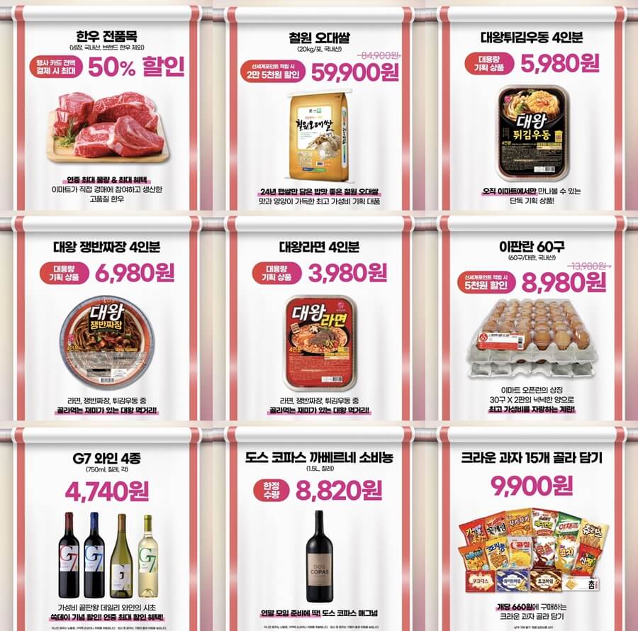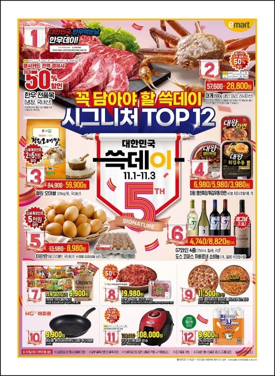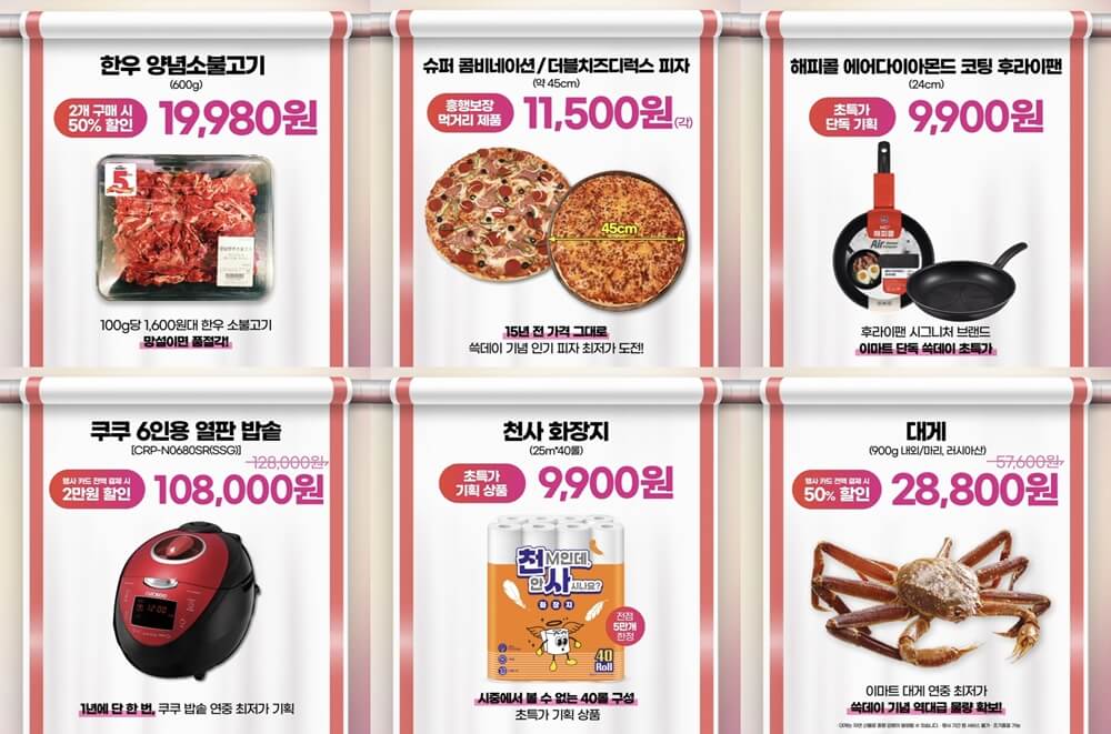 이마트는 쓱데이 할인 행사를 앞두고 이마트 쓱데이 시그니처 TOP12를 공개하기도 했는데요~ 행사카드로 전액결제시 한우 전품목을 50% 할인가로 구매할 수 있고, 철원 오대쌀을 신세계포인트 적립 시 2만 5천 원 할인받아 59,900원에 구매할 수 있어요. 또 이판란 60구 구매 시에는 5천 원을 할인받아 8,980원에 구매할 수 있고, 이마트 피자를 11,500원에 구매할 수 있으며 900g 내외의 대게를 50% 할인가로 구매할 수 있어요.