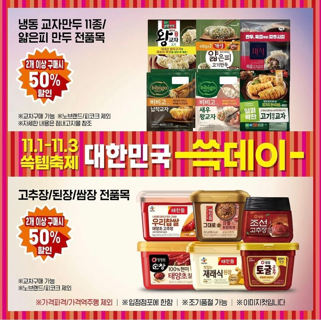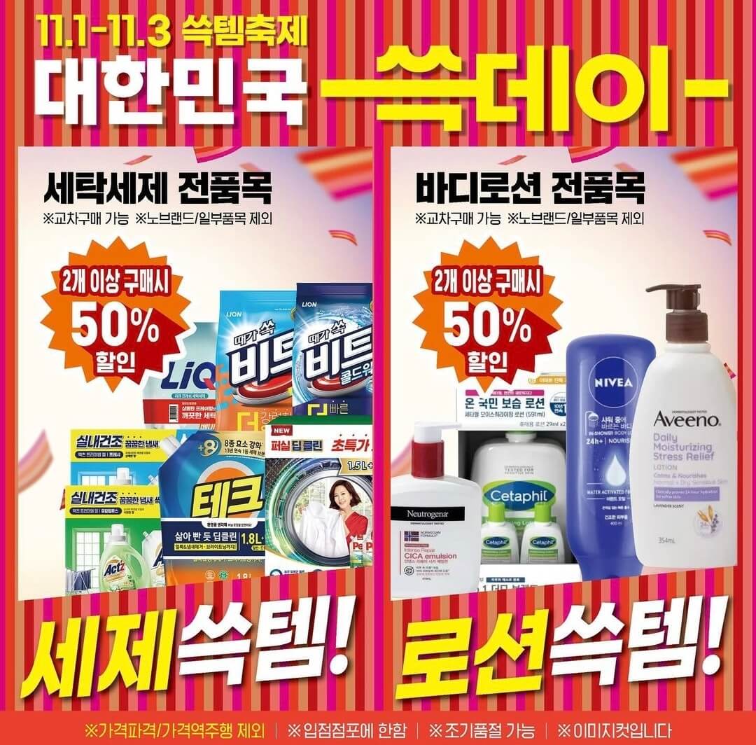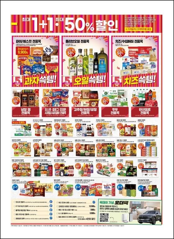 보통 이마트 쓱데이 행사 기간에는 마트내에서 판매하는 모든 상품들을 할인한다고 봐도 무방한데요~ 고기, 과일, 라면, 과자, 오일, 치즈, 세제, 로션, 냉동식품, 장류, 휴지, 치약 등을 2개 이상 구매하면 50% 할인가로 구매할 수 있으니까 이번 쓱데이도 놓치지 마세요.