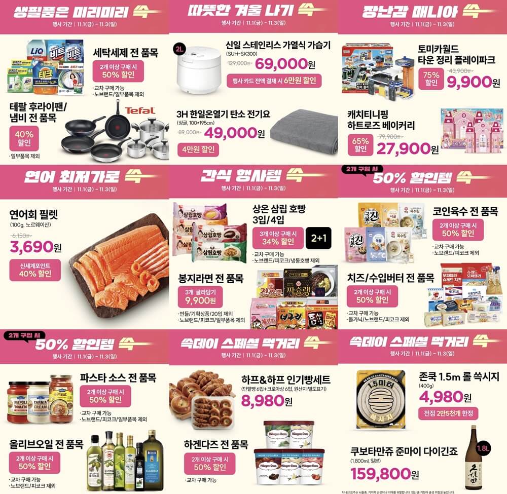 이외에도 각종 생필품들과 먹거리들을 최대 50% 할인 또는 1+1, 2+1으로 구매할수 있는데요~ 특히 쌀쌀한 날씨에 필수인 3H 한일온열기 탄소 전기요를 무려 4만 원 할인하여 4만 9천 원에 선보인다고 해요.