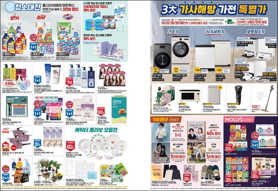 이 외에도 생필품들도 할인 및 1+1 행사를 계속해서 이어나가고, 가전 제품도 특별가로 선보여서 가격대별 상품권을 증정하는 행사도 진행 중이에요. 특히, 찬바람 부는 가을을 맞이하여 폴햄, 폴햄키즈 등에서도 1+1, 40% 할인 행사도 진행하니 참고하세요.