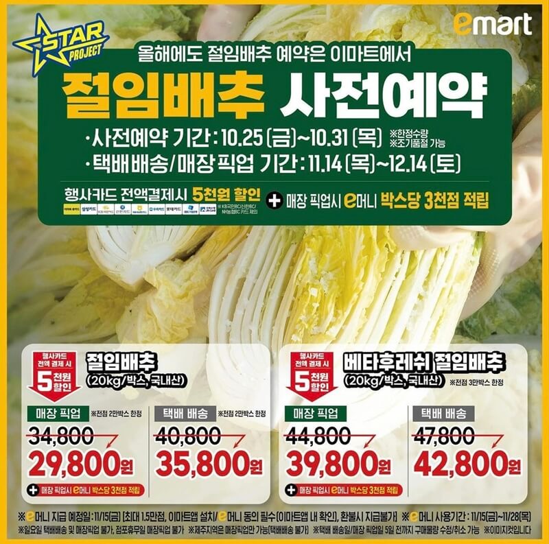또, 이마트 절임배추 사전예약을 진행할 때 매장 픽업으로 선택하면 박스당 e머니 3천 점도 추가 적립돼요.