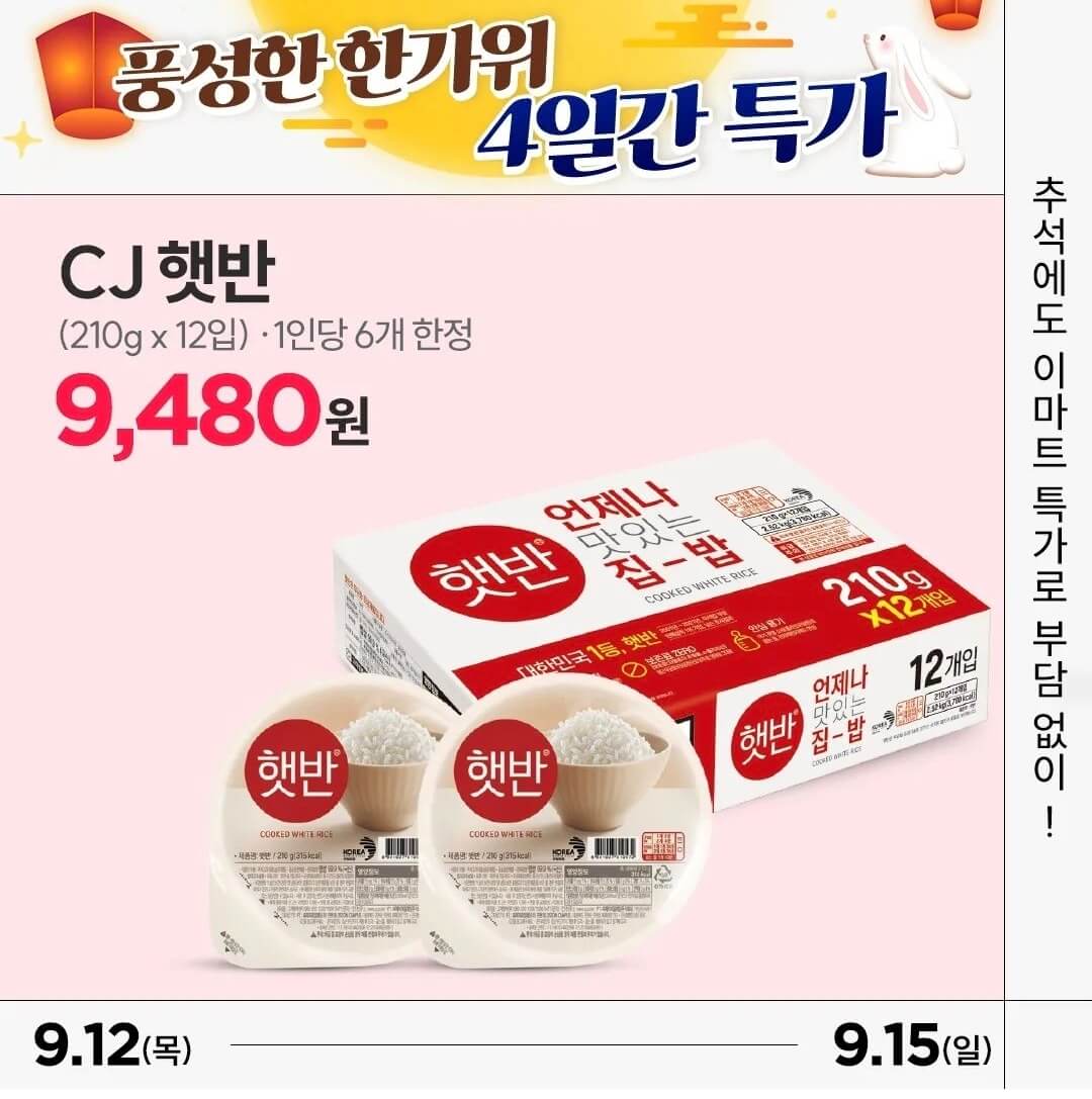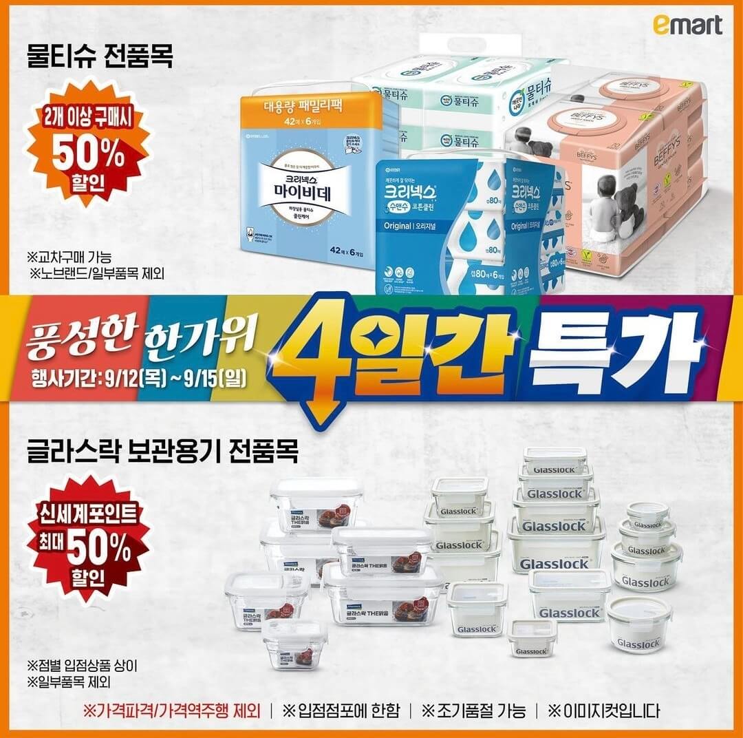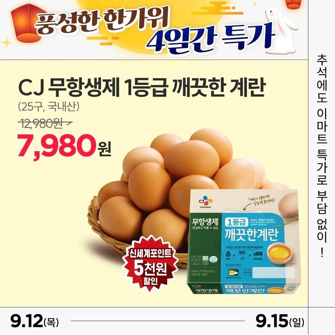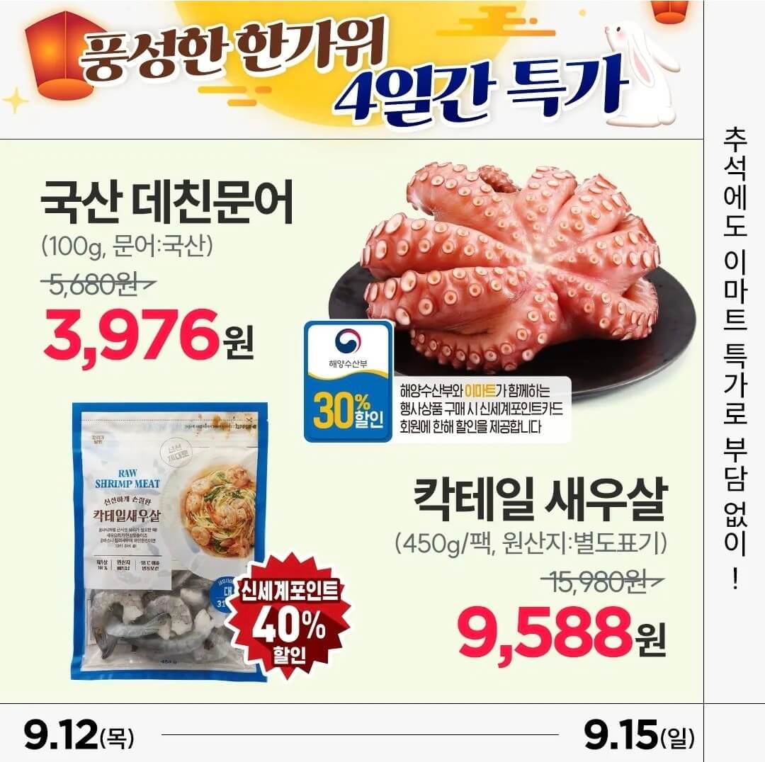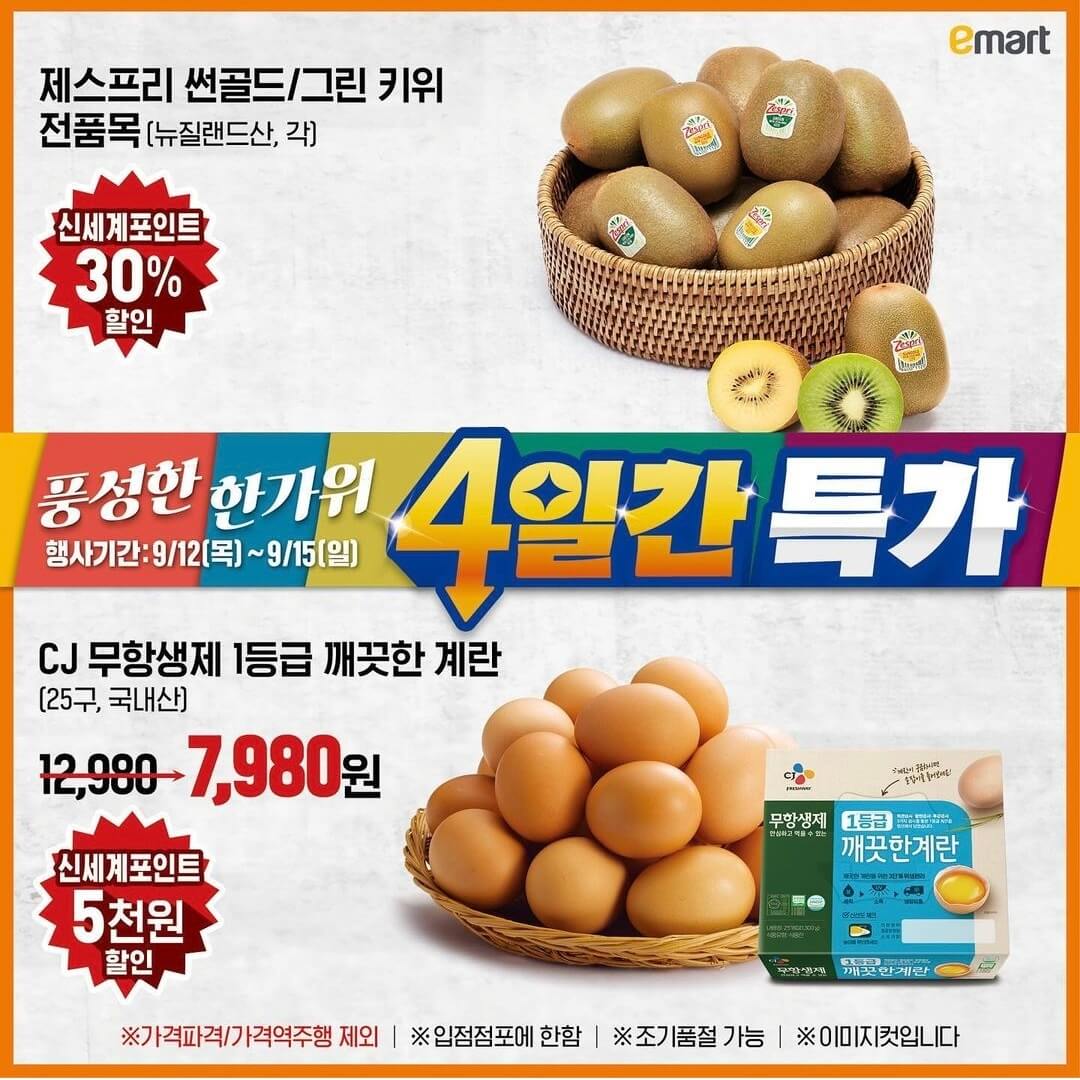 그리고 이마트는 추석연휴를 맞이해서 9월 12일(목)부터 9월 15일(일)까지 4일 동안 특가 할인행사를 진행하는데요~ 와규와 돼지고기 BBQ모둠, 냉장 갈빗살 후레쉬팩을 할인가로 구매할 수 있고, 제스프리 썬골드/그린키위 전품목과 CJ 무항생제 1등급 깨끗한 계란을 할인가로 구매할 수 있어요.