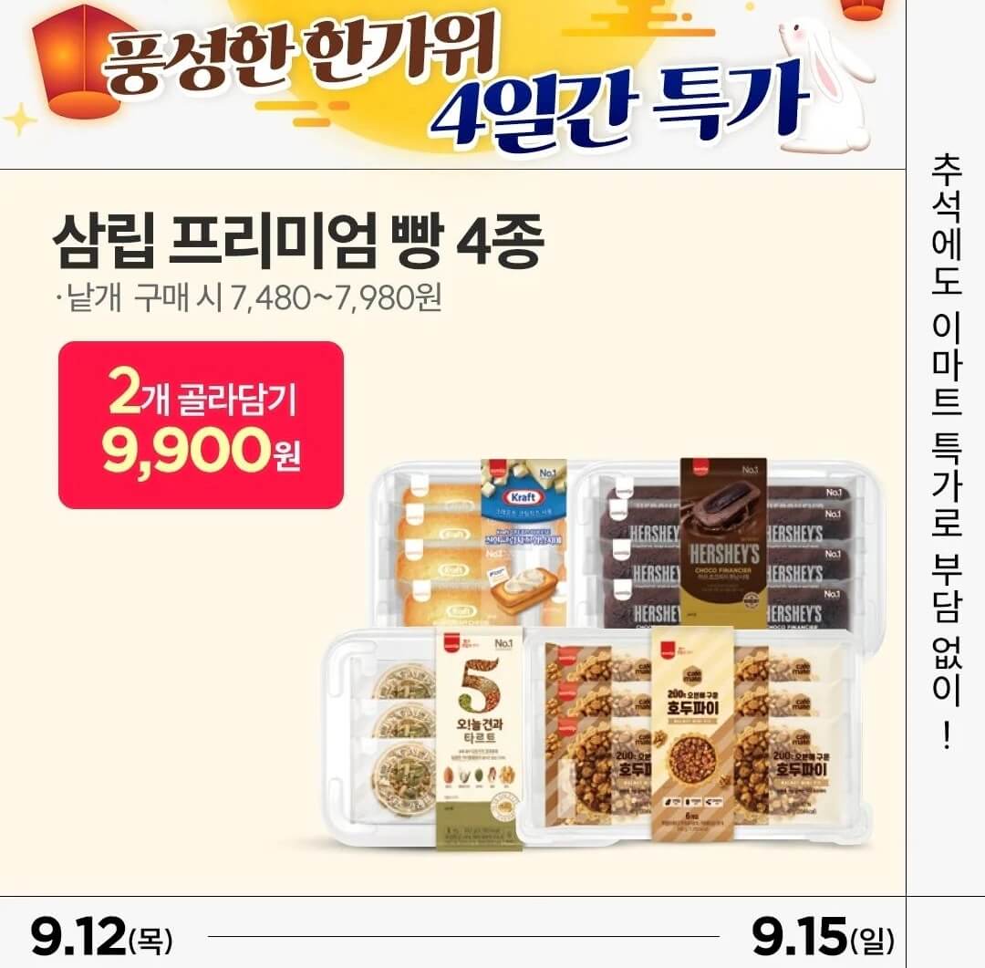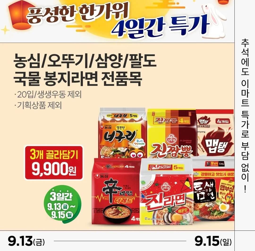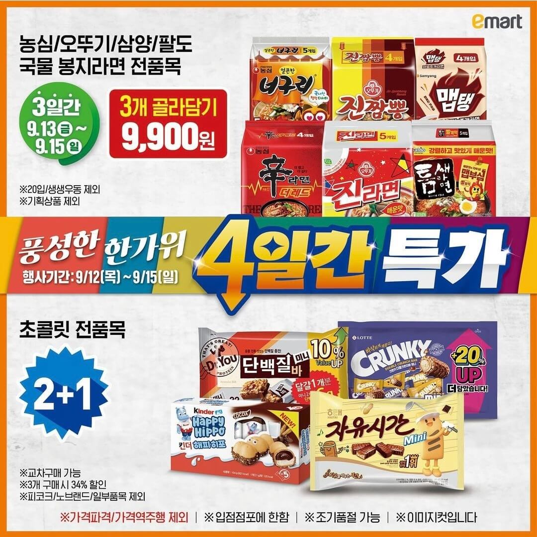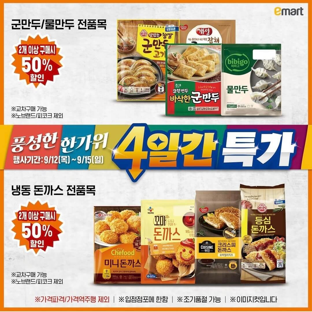 군만두와 물만두 전품목과 냉동 돈가스 전품목은 2개 이상 구매 시 50% 할인가로 구매할 수 있고, 국물 봉지라면 전품목은 3개 골라담기해서 9,900원에 구매할수 있어요. 이 외에도 초콜릿 전품목은 2+1으로 구매할수 있고, 물티슈 전품목과 글라스락 보관용기 전품목도 50% 할인가로 구매할 수있으며며 삼립 프리미엄 빵 4종과 CJ 햇반, 국산 데친 문어, 칵테일 새우살 등도 할인 또는 덤으로 구매할 수 있어요.