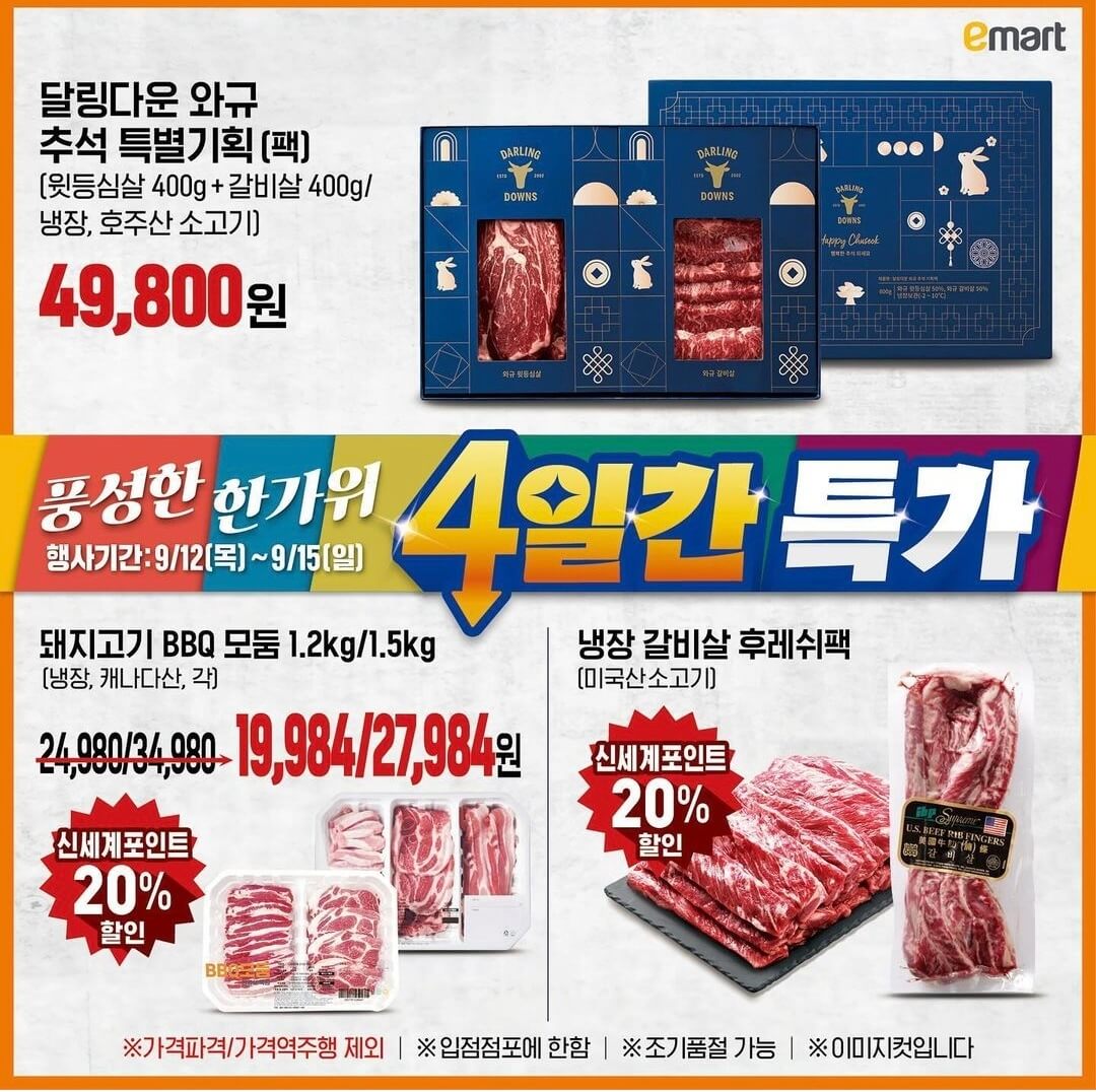 그리고 이마트는 추석연휴를 맞이해서 9월 12일(목)부터 9월 15일(일)까지 4일 동안 특가 할인행사를 진행하는데요~ 와규와 돼지고기 BBQ모둠, 냉장 갈빗살 후레쉬팩을 할인가로 구매할 수 있고, 제스프리 썬골드/그린키위 전품목과 CJ 무항생제 1등급 깨끗한 계란을 할인가로 구매할 수 있어요.