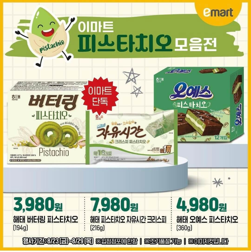 이 외에도 이마트 꽃게 행사 기간까지 호주산 냉장 찜갈비를 100당 2,380원에 선보이고, 제철과일 또한 할인가에 선보이며 이마트 단독으로 피스타치오 모음전도 선보인다고 하니까 피스타치오 마니아분들은 지금 바로 이마트로 달려가보세요.