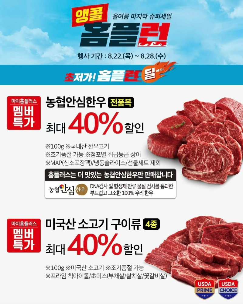 그리고 역시나 홈플러스 홈플런 하면 빠질 수 없는 농협안심 한우 전품목을 최대 40% 할인하고, 미국산 소고기 구이류 4종도 최대 40% 할인하며 노르웨이 생연어 전품목은 30% 할인, 완도 전복 전품목은 무려 50% 할인가로 구매할 수 있어요.