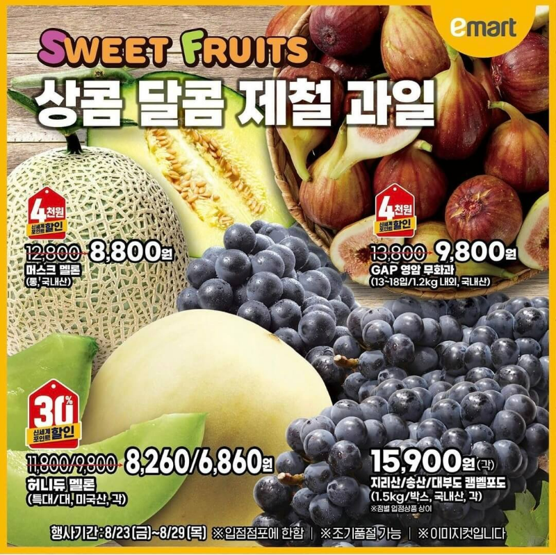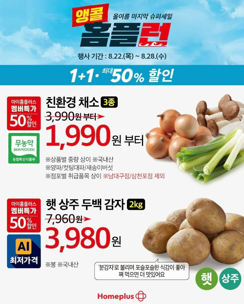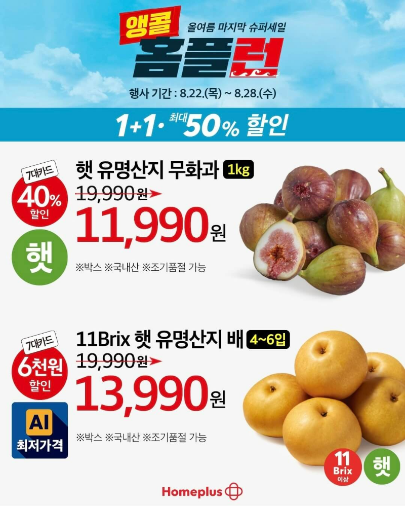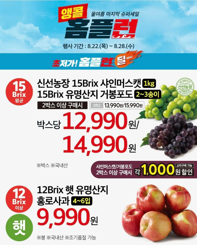 그리고 홈플러스는 올여름 마지막 슈퍼세일 기간인 만큼 홈플러스 꽃게 행사 외에도 제철을 맞은 샤인머스캣과 포도는 2박스 이상 구매 시 각 1,000원 할인하고 올해 수확한 햇과일인 유명산지 홍로사과와 배는 각 9,990원 / 13,990원에 구매 가능해요.