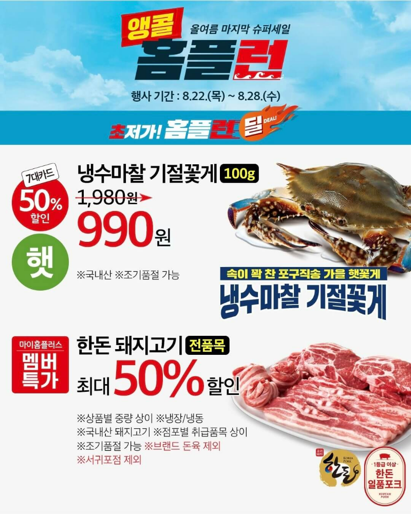이번주는 홈플러스 앵콜 홈플런 행사 마지막 기간인데요~ 이 기간 동안 홈플러스에서도 이마트와 마찬가지로 꽃게를 판매한다고 해요. 홈플러스 꽃게 행사 기간은 8월 22일부터 28일까지이고 이 홈플러스 꽃게 행사 기간동안 냉수마찰 기절 꽃게를 7대 카드로 결제 시 100g당 990원에 선보인 다고 해요.