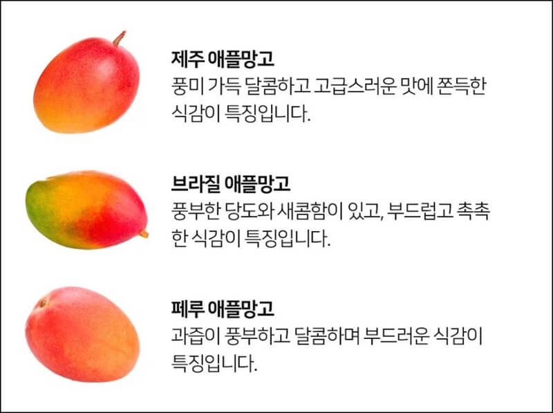 제주에서 나는 애플망고는 풍미 마득 달콤하고 고급스러운 맛에 쫀득한 식감을 가지고 있고, 브라질에서 나는 애플망고는 풍부한 당도와 새콤하면서 부드럽고 촉촉한 식감을 가지고 있어요. 그리고 페루에서 나는 애플망고는 과즙이 풍부하고 달콤하면서 부드러운 식감을 가지고 있고요.
