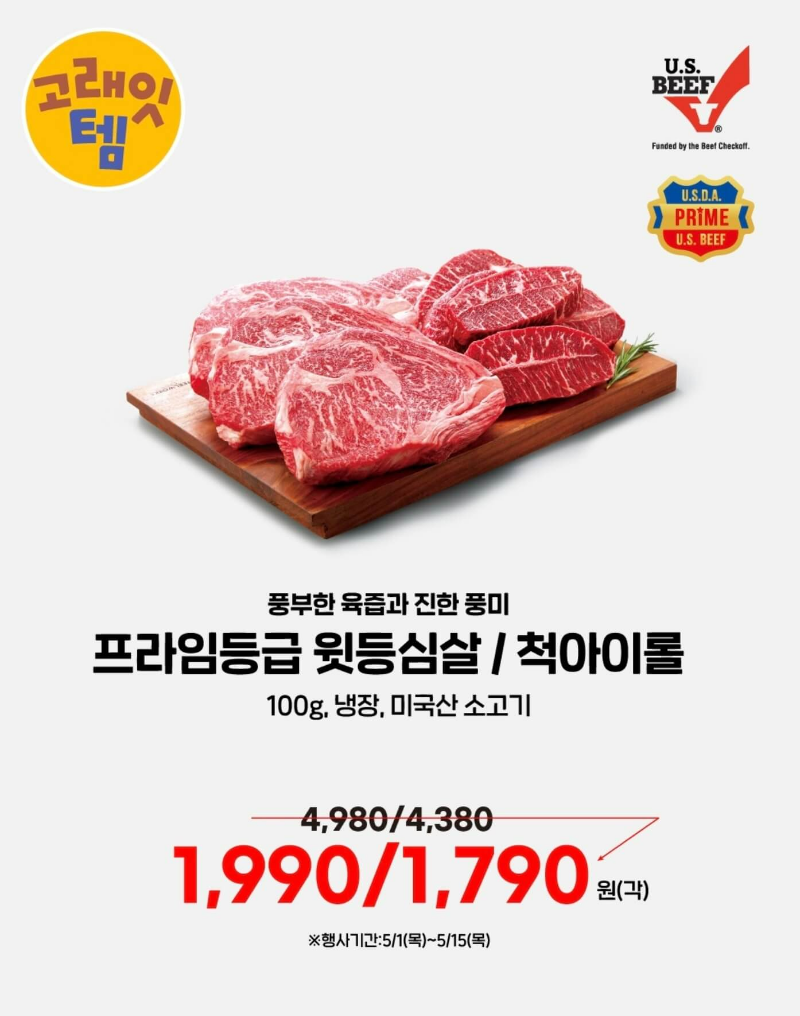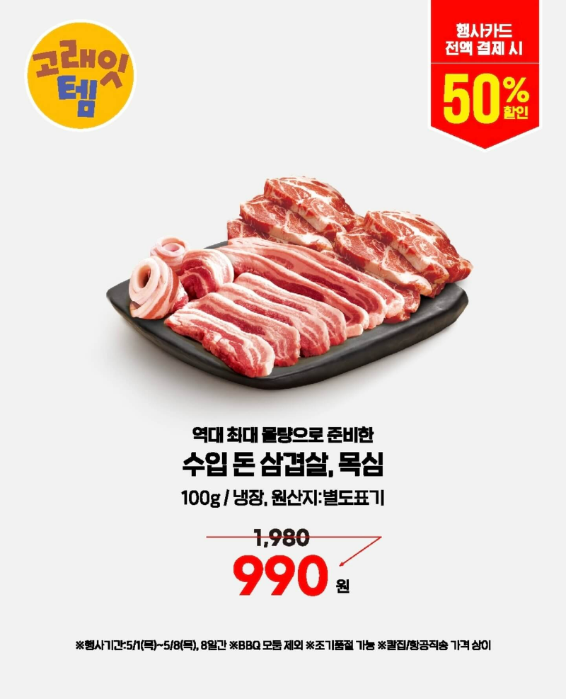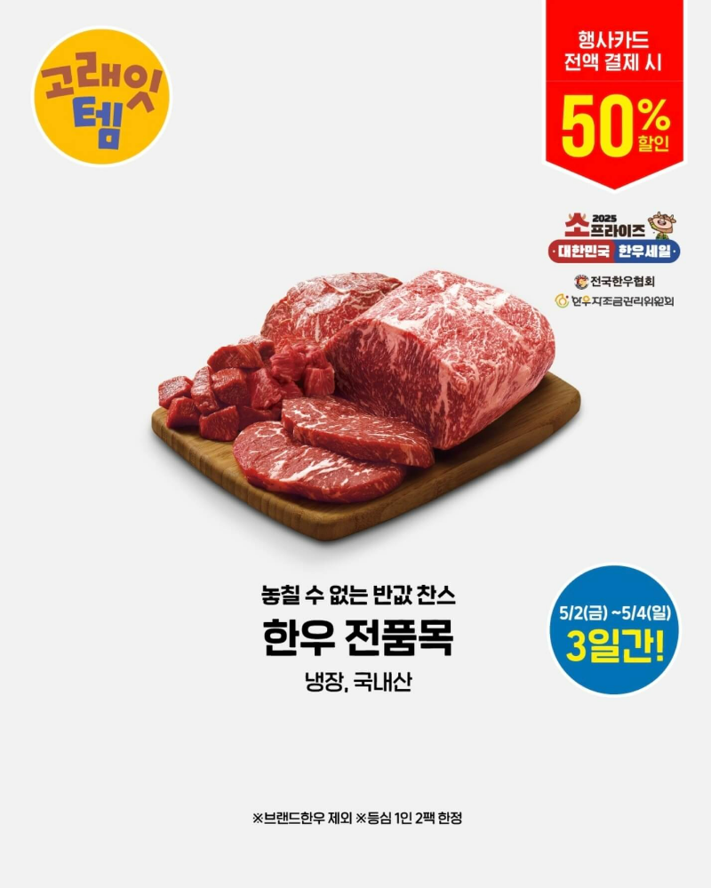 고래잇 페스타 같은 이마트 전단광고 대형 행사가 시작되면 고기 할인도 빼놓을 수가 없는데요~ 이번행사 전체 기간 동안 프라임 등급 윗등심살/척아이롤(미국산)을 100g당 1,990원/1,790원에 선보이고, 냉장 항정살/등심덧살/등갈비 100g을 행사카드로 결제 시 40% 할인한 1,788원에 판매하며 5월 2일부터 4일까지 행사카드로 전액 결제시 한우 전품목을 50% 할인한다고 해요.