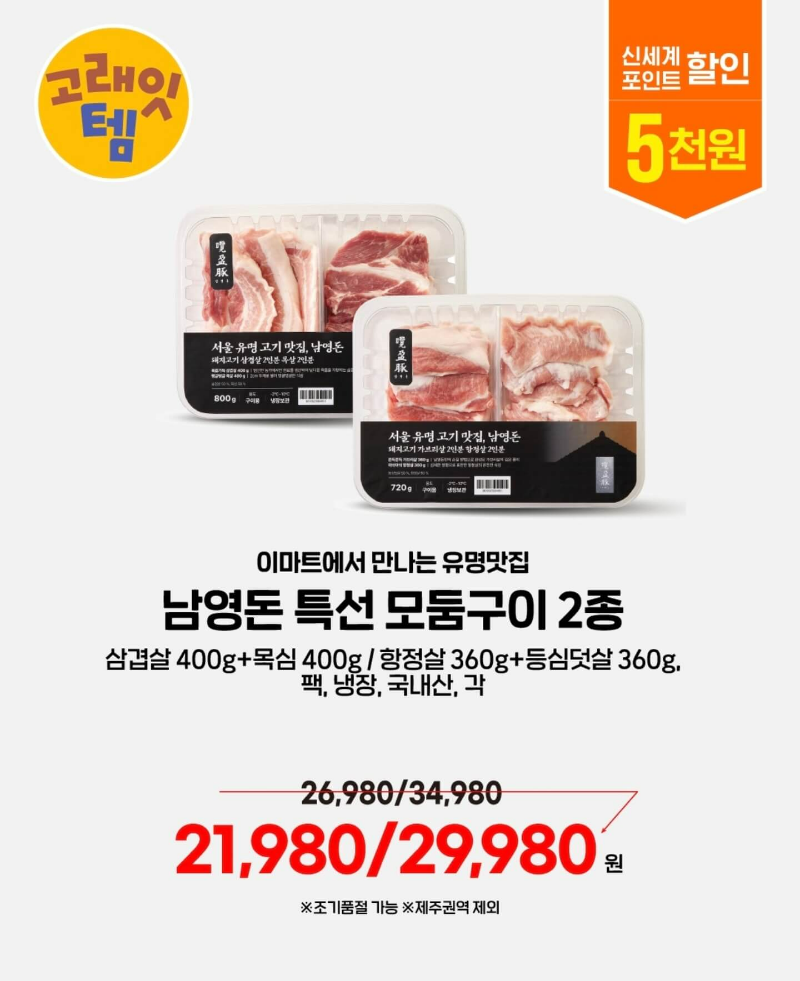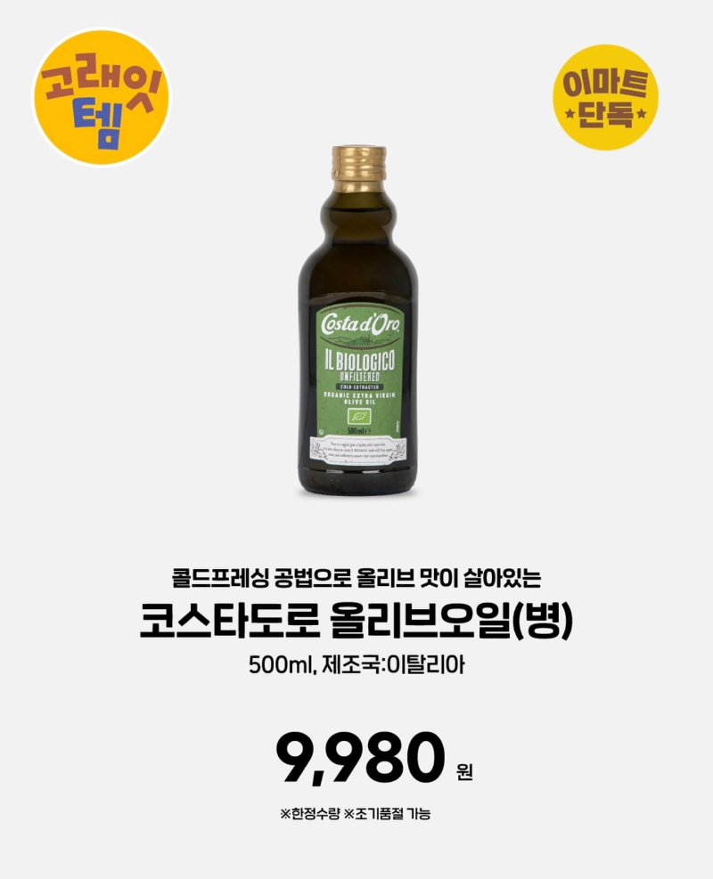 이제 이마트 전단광고 행사기간이 되면 빠질 수 없는 게 바로 올리브오일인데요~ 이번 행사에서는 단독으로 코스타도르 올리브오일을 9,980원에 선보이고, 대왕님표 여주쌀 10kg를 신세계포인트 적립 시 34,900원에 선보이며 온 가족 손질 민물장어와 바닷장어를 50% 할인한 29,900원/24,900원에 선보인 다고 해요.