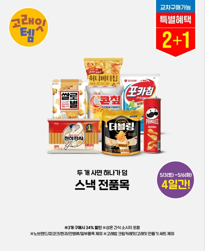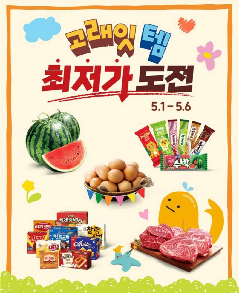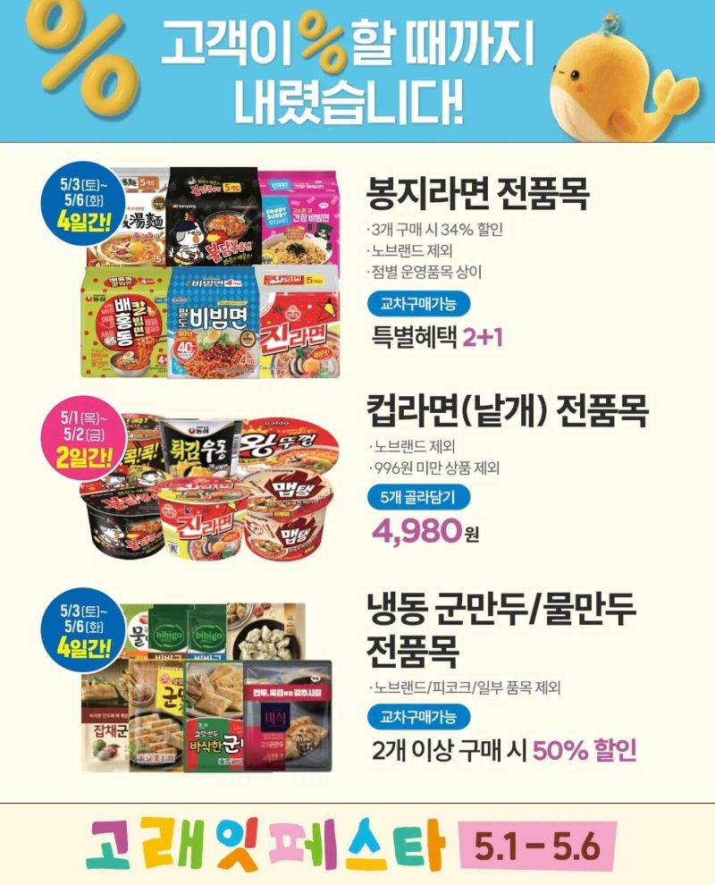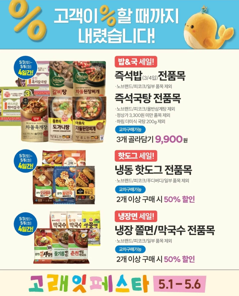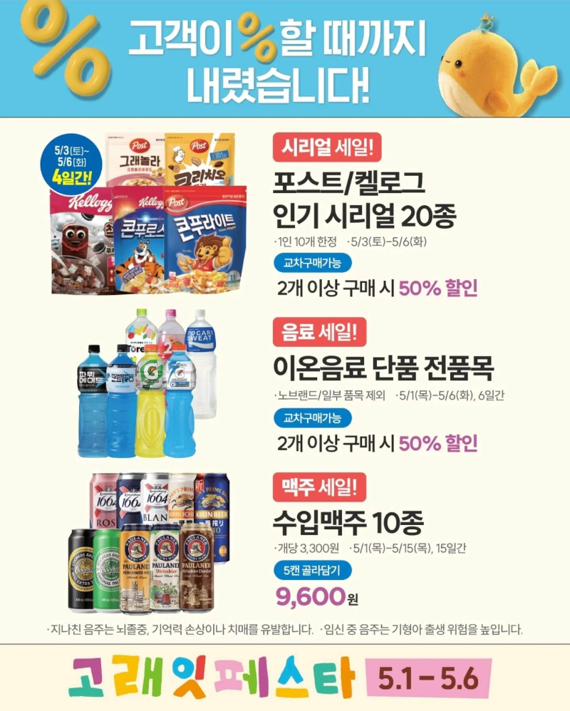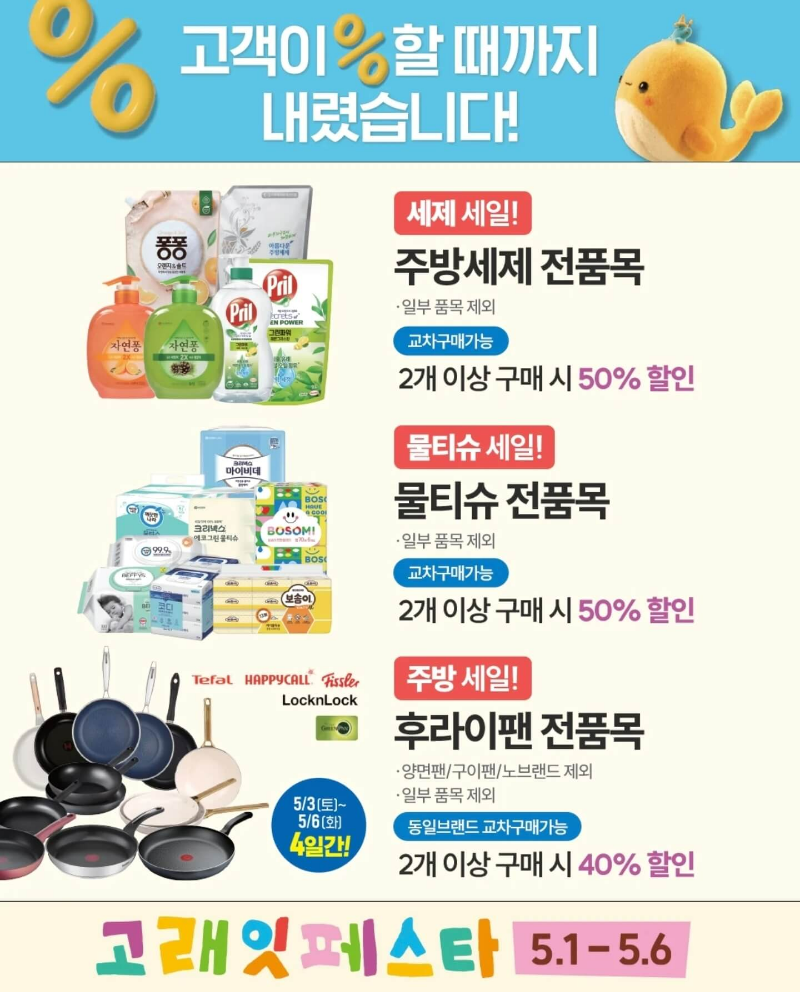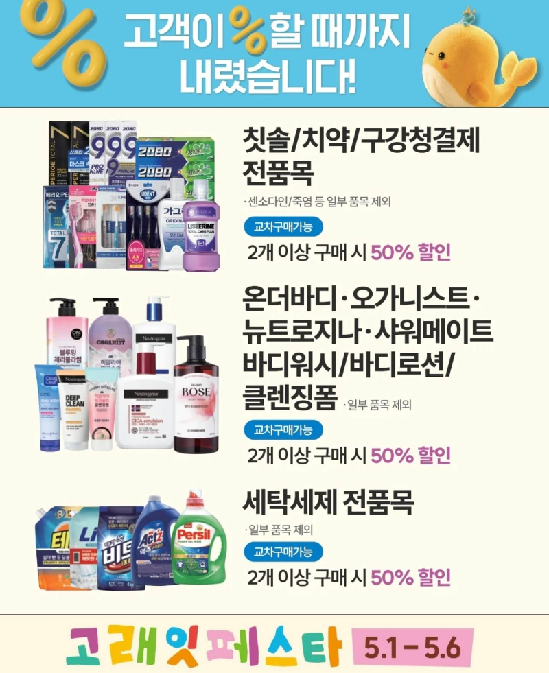 또, 가공/생활용품 등 생필품 반값 행사도 풍성하게 진행되는데 전체 행사기간 동안 세탁세제, 주방세제, 물티슈, 칫솔/치약/구강청결제, 도루코/쉬크/니베아 면도기, 하기스 기저귀, 덴비 단품식기 전품목 등 약 80여 가지의 생활필수품을 할인하고, 5월 3일부터 6일까지는 냉동 군만두, 물만두, 포스트/켈로그 인기 시리얼, 이온음료, 포도씨유/카놀라유/해바라기유/국산 두부, 고추장/된장/쌈장 등 약 70여 가지의 인기 가공식품을 2개 이상 구매 시 50% 할인된 가격에 선보인 다고 해요.
