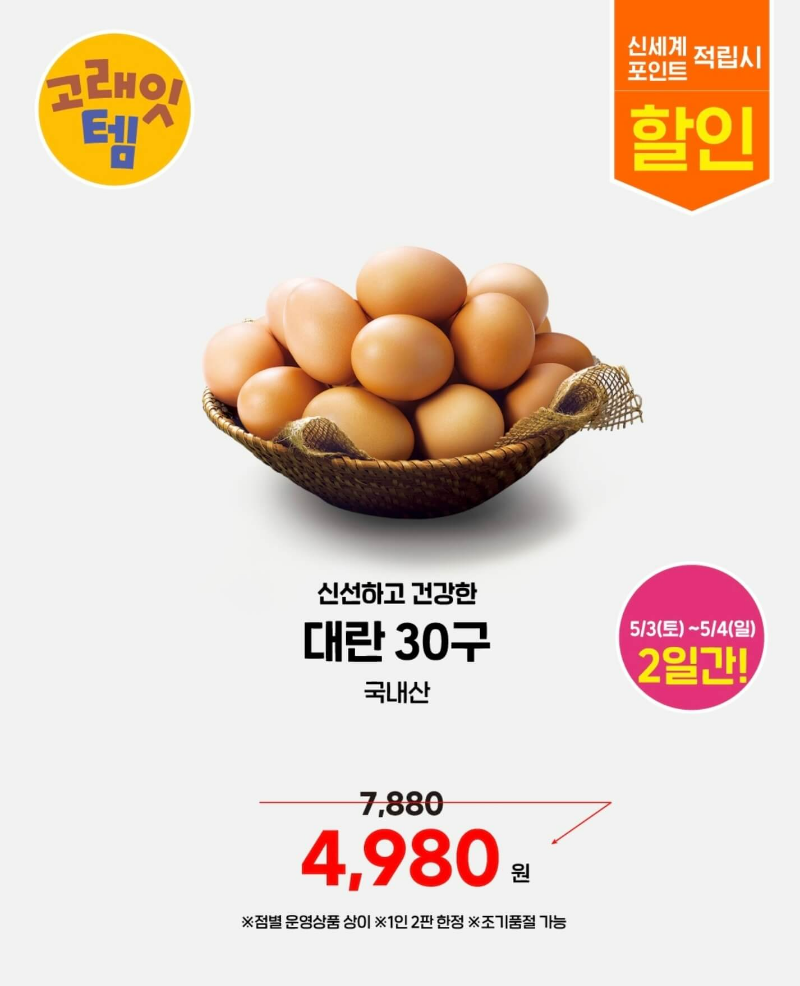 그리고 5월 3일~4일에는 필수 식재료인 계란 행사가 진행되는데요~ 신세계 포인트 적립시 대란 30구 1판을 4,980원 / 브랜드 계란 전품목을 30% 할인 판매한다고 해요.