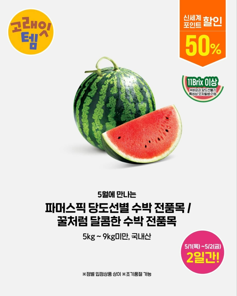 먼저 이마트에서는 5월 1~2일까지 파머스픽 당도선별 수박 전품목과 꿀처럼 달콤한 수박 전품목을 신세계 포인트 적립 시 50% 할인가로 구매할수 있는데요~ 이마트에서는 이번 고래잇 페스타 행사가 진행되기 전에 산지와 협업을 진행했고, 최대 물량을 확보하여 착한 가격으로 선보인다고해요. 아무래도 조기품절이 가능한 품목인만큼 올해 첫 수박을 맛보고 싶다면 서둘러서 방문하세요.