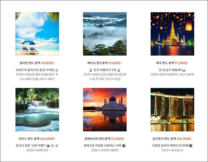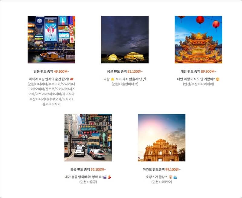 유류할증료와 공항시설료 등을 모두 포함한 편도 총액 기준으로 국내선 같은 경우에는 1만 8,400원부터 구매가 가능하고, 국제선 같은 경우에는 일본 4만 9,300원 / 중화권 8만 9,900원 / 동남아 7만 6,000원 / 몽골 8만 3,100원 / 대양주 13만 6,400원부터 판매해요.