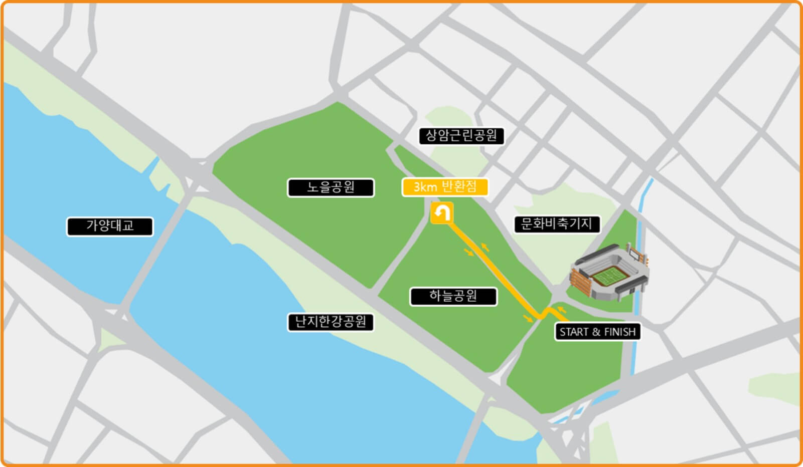 3km 코스는 가볍게 걷는 코스이기 때문에 유아차를 끌고도 참여할 수 있는데요~ 3km 코스는 평화광장(출발) > 하늘육교 > 난지천공원 화장실(반환) > 하늘육교 > 평화광장(골인)으로 돌아오는 코스예요.