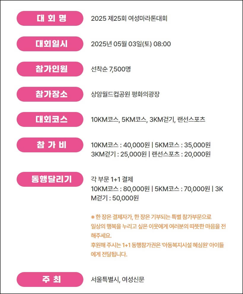 서울시와 (주)여성신문사가 주최하는 제25회 여성 마라톤 대회 참가신청이 시작되었어요. 올해 제25회를 맞은 서울 여성 마라톤 대회는 2001년부터 시작해 지금까지 약 28만 명의 시민과 함께했는데요~ 5월을 대표하는 가족 마라톤 대회인 서울 여성 마라톤 대회 신청 접수 정보 알려드릴게요.