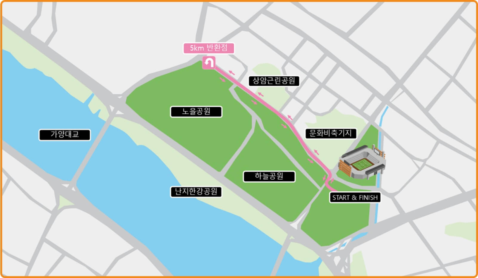 제25회 서울 여성 마라톤 대회 5km 코스도 기록 측정을 제공하기 때문에 러닝 초보들이 자신만의 공식 기록을 측정할 수 있는 기회이기도 한데요~ 5km 코스는 평화광장(출발) > 경기장 R > 구룡사거리 인근(반환점) > 경기장 R > 평화광장(골인)으로 돌아오는 코스예요.