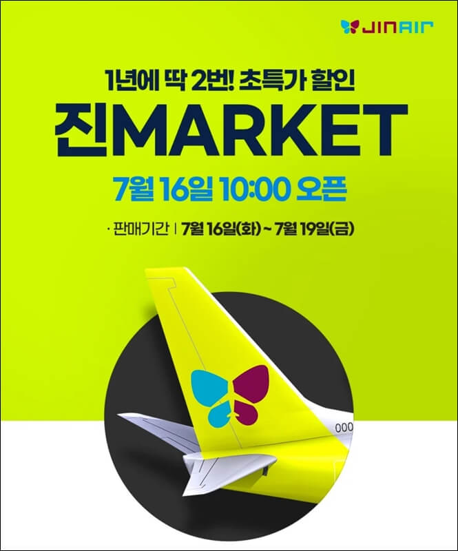 올해 하반기 최대 특가 프로모션인 진마켓은 7월 16일인 오늘 오전 10시에 오픈이 되는데요~ 진에어 항공권 예약 특가 기간은 7월 19일(금)까지 단 4일만 진행돼요.