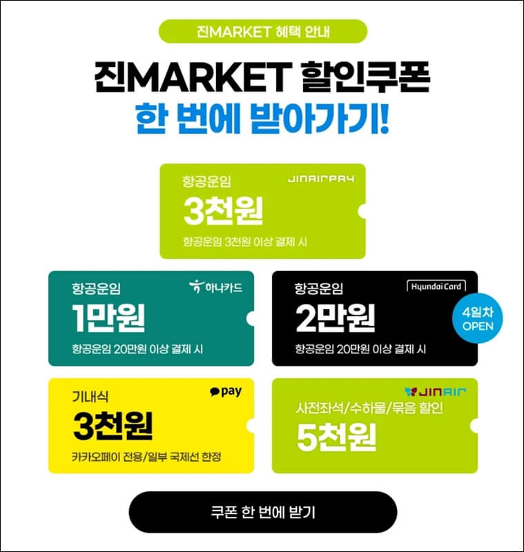 그리고 또 하나 놓치지 말아야할게 바로 할인쿠폰인데요~ 진에어페이 3천 원 쿠폰과 하나카드 1만 원, 현대카드 2만 원, 부가서비스(사전좌석, 수하물, 묶음할인) 5천 원, 카카오페이 기내식 3천 원 할인쿠폰도 놓치지 말고 받아놓으세요.