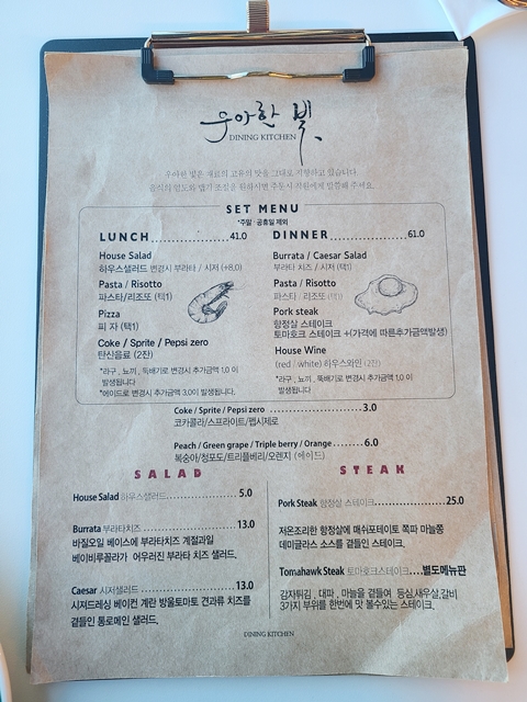 우아한빛은 양식을 전문으로 하는 음식점인데요~ 런치와 디너 세트메뉴도 있고, 토마호크 스테이크 같은 경우에는 그램수에 따라서 주문할 수 있다는 점이 참 독특했던 것 같아요. 와인과 스페셜 메뉴, 프라이, 맥주, 파스타, 리조또, 피자 등등 메뉴가 꽤 다양해서 어떤 걸 주문해야 할지 한참을 고민했답니다 ㅎ