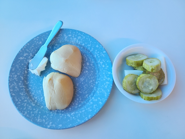 메뉴를 주문하면 식전빵과 크림치즈, 피클이 나오는데 식전 빵이 따뜻해서 생각보다 꽤 맛있더라고요? 크림치즈도 좋은데 발사믹 소스나 꿀에 찍어먹어도 맛있을 것 같은 느낌이었어요.