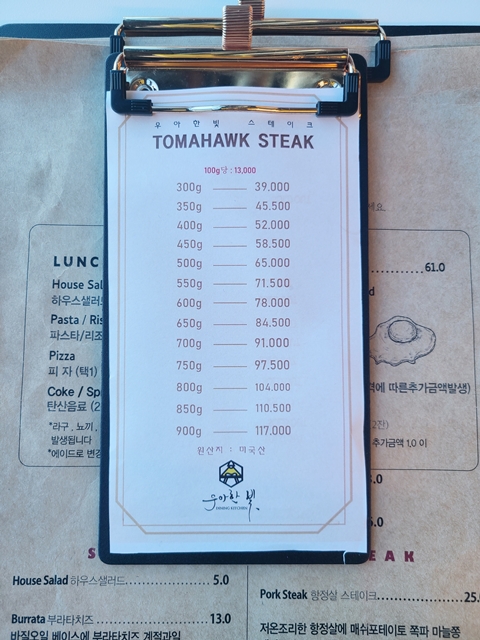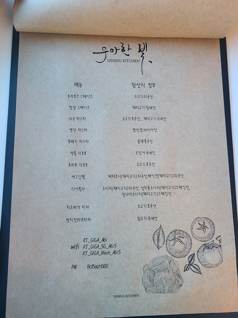우아한빛은 양식을 전문으로 하는 음식점인데요~ 런치와 디너 세트메뉴도 있고, 토마호크 스테이크 같은 경우에는 그램수에 따라서 주문할 수 있다는 점이 참 독특했던 것 같아요. 와인과 스페셜 메뉴, 프라이, 맥주, 파스타, 리조또, 피자 등등 메뉴가 꽤 다양해서 어떤 걸 주문해야 할지 한참을 고민했답니다 ㅎ