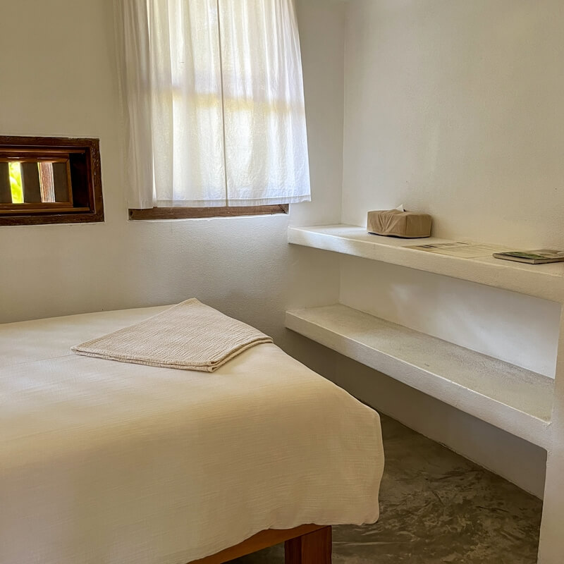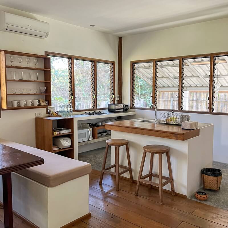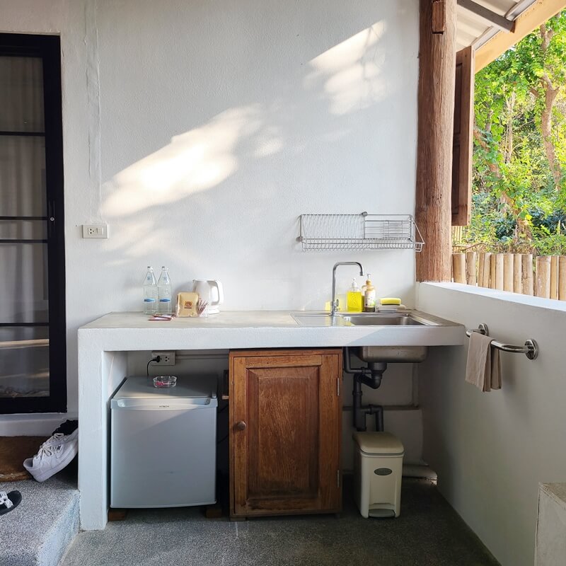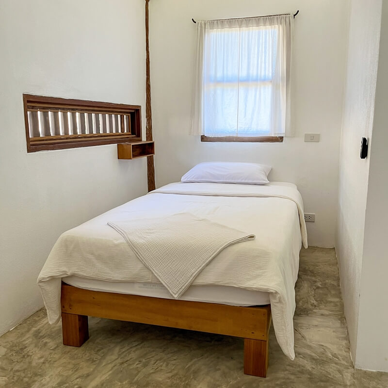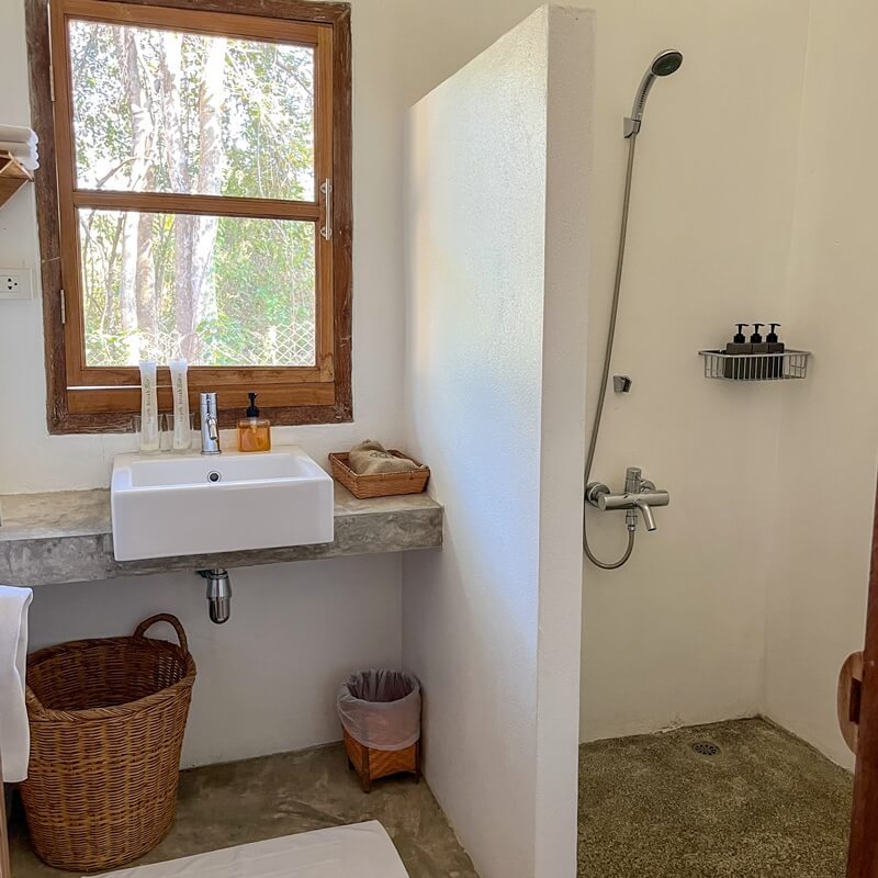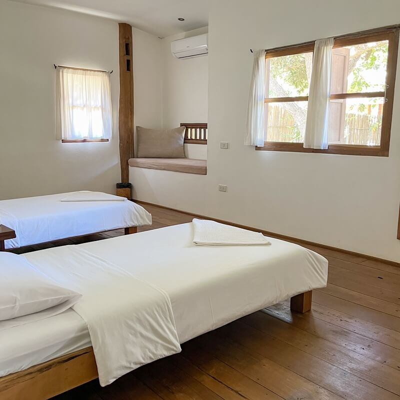 두 건물 중에서 작은 룸에도 싱글 침대 두대가 놓여있고, 화장실 및 샤워실도 좋고, 미니 테이블도 좋고요~ 중간중간 창문이 있어서 커튼사이로 들어오는 바람과 햇빛이 너무 좋았는데 창문이 방충망(?)으로만 되어있다 보니 아침저녁으로는 춥더라고요. 물론 작은 룸에는 에어컨이 없었는데도 낮에도 전혀 덥지 않고 시원했어요.