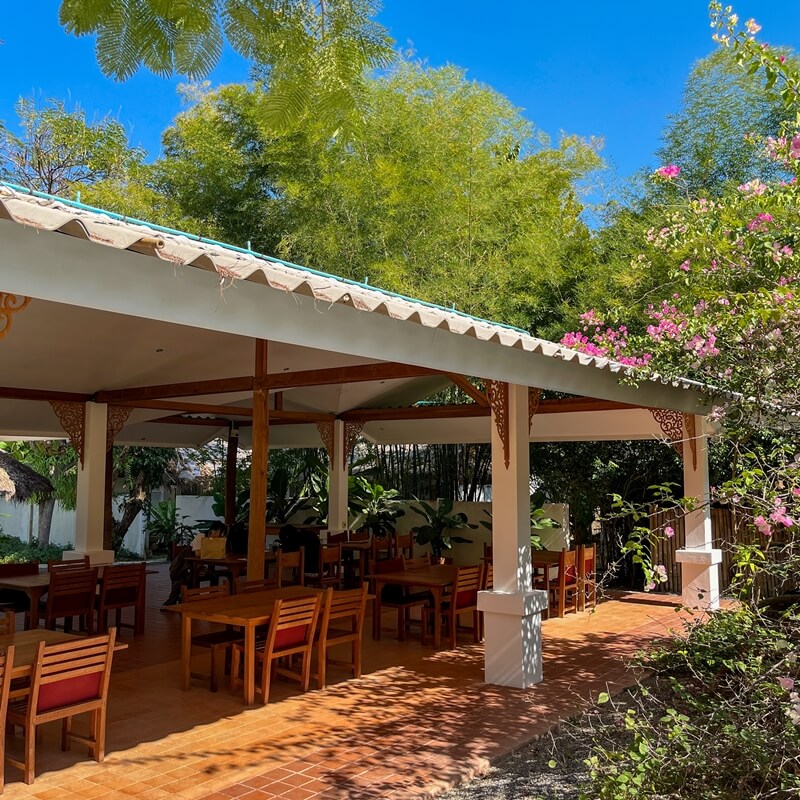 조식을 먹을 수 있는 식당 앞에는 큼직한 수영장도 있어서 물놀이하기에도 정말 좋았어요. 게다가 호시하나는 야외에서 할 수 있는 마사지 및 요가 프로그램도 함께 운영하고 있기 때문에 미리 예약해서 하시는 분들도 계시더라고요.