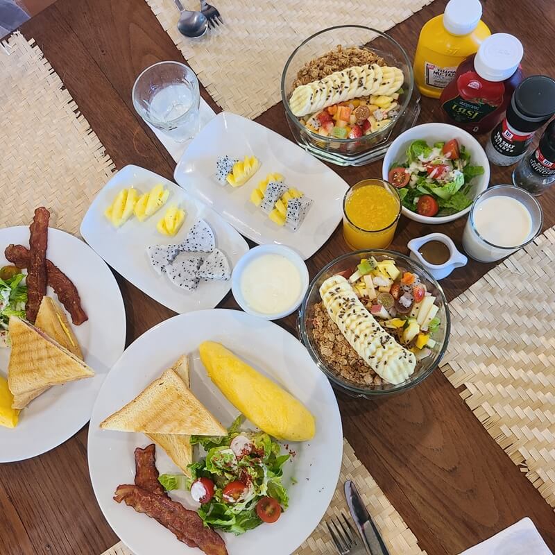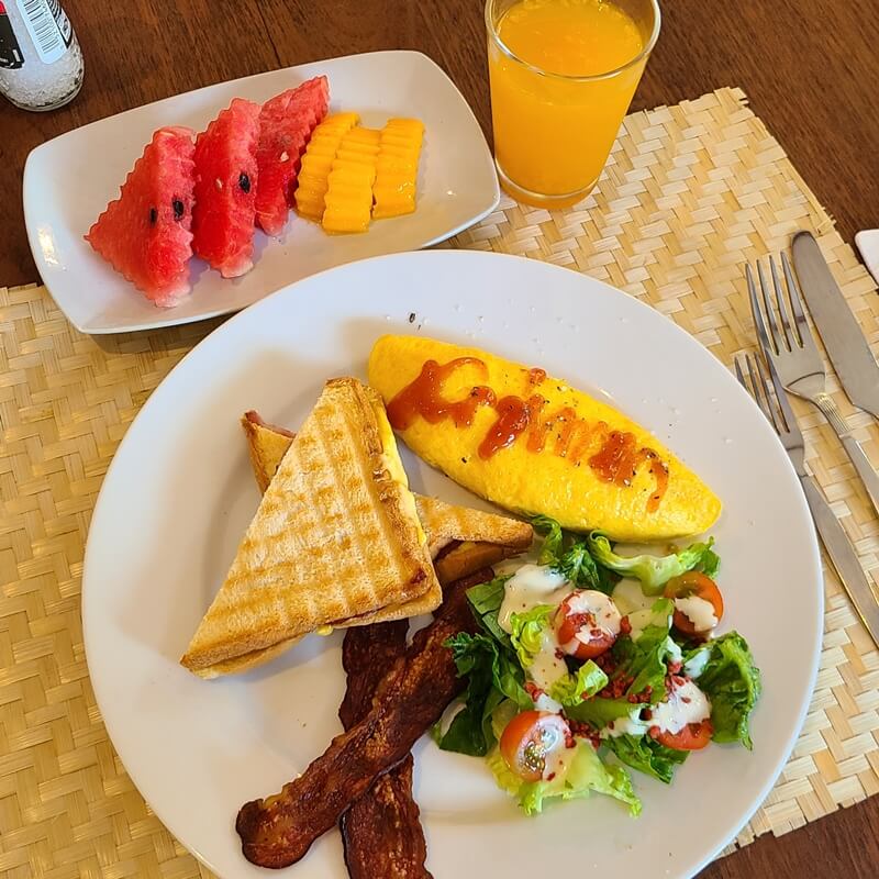 조식도 미리 주문해 놓고 아침에 시간 맞춰 야외 공간으로 가서 룸 이름이 적힌 곳에 자리를 잡고 앉으면 직원분께서 준비되는 대로 가져다줍니다. 베이컨이 과하게 구워지긴 했지만 모든 조식이 다 맛있었어요.