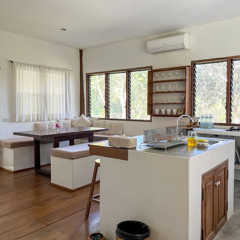 반대쪽 룸은 거실공간이 크다 보니 테이블도 큼직하고 앉을 수 있는 체인도 기다랗게 두 공간에 놓여있어서 인원수가 많은 분들이 이용하기에도 좋겠더라고요. 게다가 주방용품도 모든 게 다 구비되어있다 보니 이 또한 굉장히 편리했고요.