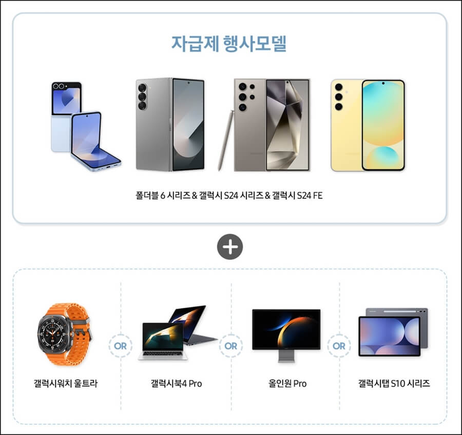 여기에 추가로 혼수 및 입주, 이사 증빙 후에 삼성가전을 구매하면 최대 80만 원 상당의 혜택을 받을 수 있고, 갤럭시 자급제폰 행사모델과 갤럭시 북, 갤럭시워치 울트라, 갤럭시탭, 올인원 프로 중 한가지를 동시에 구매하면 최대 10만원 상당의 혜택을 받을수 있어요.