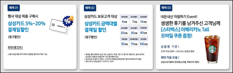그리고 또 하나, 삼성스토어몰에서 행사 대상 제품을 구매하면 삼성카드 청구할인과 금액대별 결제일 할인을 받을수 있으니까 꼼꼼하게 따져보고 비교해서 구매하면 될 것 같아요.