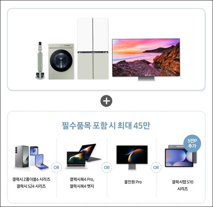 그럼 본격적으로 코리아 세일 페스타 삼성전자 혜택에 대해 알아볼게요. 첫 번째는 스마트 패키지라고 해서 행사 품목 중 2 품목 이상 구매하면 최대 459만 삼성전자 포인트 혜택을 받을 수 있는데요~ 단, 행사하는 매장과 모델에 따라서 다르니까 참고하세요.