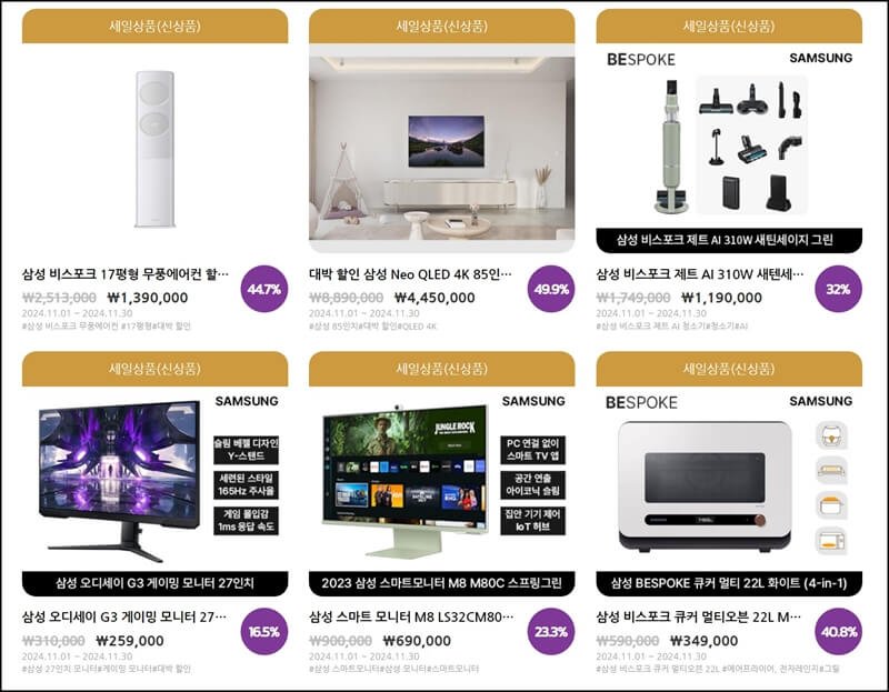 또, 11월 9일부터 본격적으로 시작되는 코리아 세일 페스타 홈페이지에서도 코리아 세일 페스타 삼성전자 품목을 확인할 수 있는데요~ 새 제품부터 리퍼 제품까지 50%에 가까운 할인율로 만나볼 수 있으니까 위의 포스팅도 참고하세요.