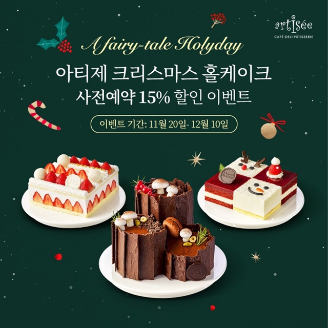 제가 좋아하는 아티제에서는 크리스마스 홀케이크 사전예약 15% 할인 이벤트를 진행한다고 합니다. 게다가 클럽 아티제 어플 내에서 홀케이크를 예약하면 아티제 케이크 토퍼와 아티제 시즌 캔들 세트를 추가로 증정한다고 해요.