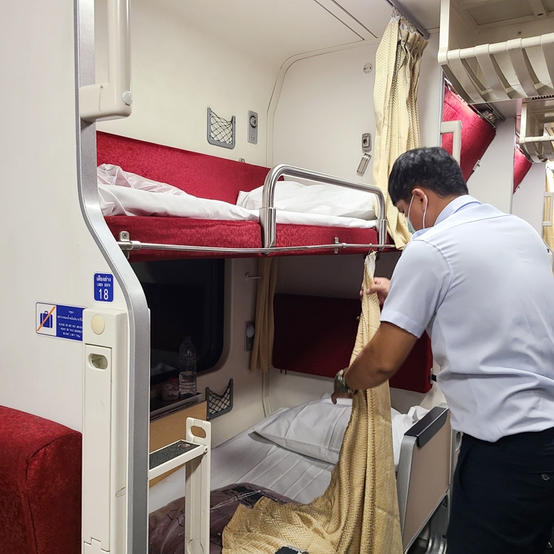 커튼도 1층, 2층 나누어서 칠 수 있어서 좋고, 태국 슬리핑기차 이용 시 2층은 에어컨이 가까워서 엄청 춥다고 해 걱정하며 양털 후리스랑 다 챙겨가서 입었는데 취침시간에는 에어컨을 약하게 줄여줘서 그런지 전혀 하나도 춥지 않았어요. 단, 2층은 흔들림이 심하기 때문에 멀미하는 분들은 멀미약 필수입니다. (저도 멀미약 먹음)