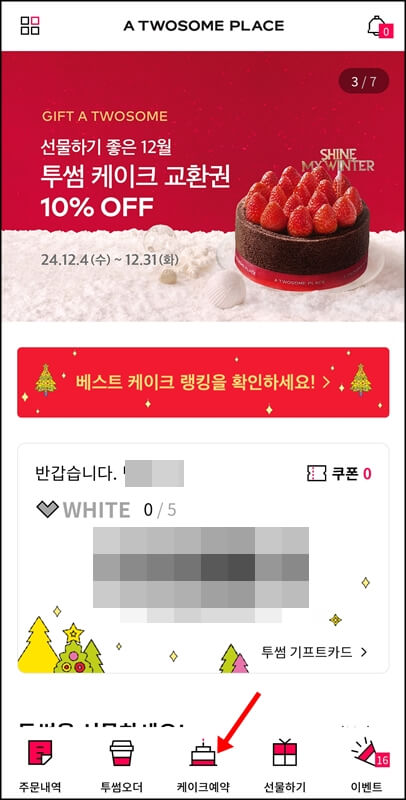 1. 그럼 이제 투썸 케이크 예약 방법에 대해서 시작해볼게요. 투썸하트 앱에 접속한 뒤 회원가입을 진행하고 로그인하여 메인 화면 하단 가운데에 있는 케이크 예약을 누르고 예약하고자 하는 메뉴를 선택한 뒤 한번 더 예약하기 버튼을 눌러주세요.