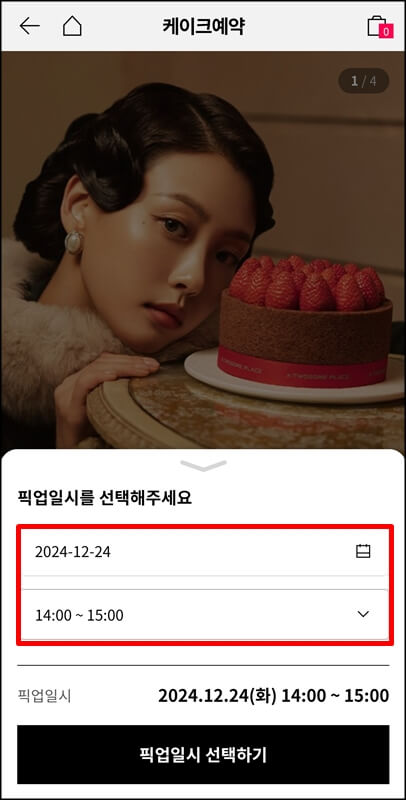 3. 매장까지 선택을 했다면 투썸 케이크 예약후 픽업할 날짜와 시간을 선택한 뒤 픽업일시 선택하기 버튼을 클릭하세요.