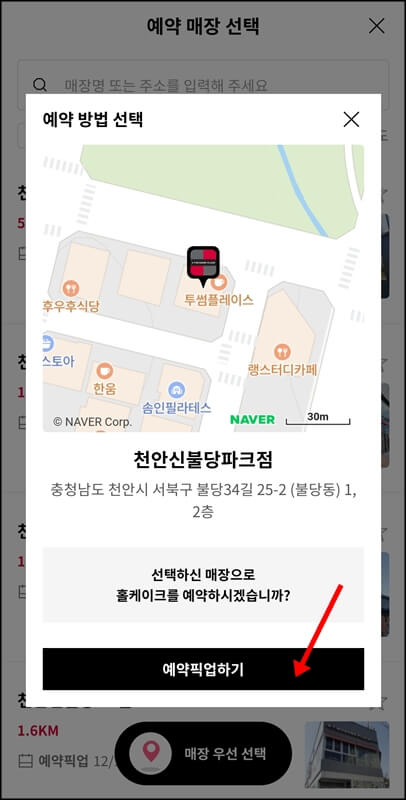 2. 예약하기 버튼을 클릭하면 예약할수있는 매장을 선택해야 하는데요~ 내 위치를 기반으로 투썸 매장이 나열되니까 내가 픽업하기 좋은 매장을 선택하여 예약픽업하기를 클릭하세요.