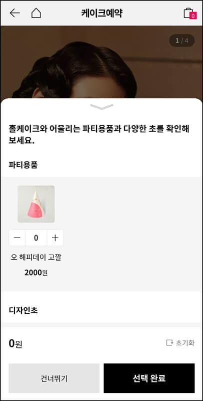 4. 그럼 케이크를 픽업할때 함께 구매할 파티용품 및 초를 선택하면 되는데요~ 파티용품, 디자인초, 숫자초는 비용이 있고, 일반초는 무료로 제공되니까 필요한 용품들을 고르고 선택완료 버튼을 클릭하세요.