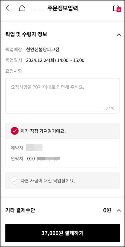 6. 쿠폰을 적용했다면 스크롤을 밑으로 내려서 픽업수령자 정보를 다시 한번 확인하고, 요청사항이 있다면 요청사항을 입력한 뒤 직접 또는 대리 픽업을 선택하세요. 대리 픽업으로 선택했다면 픽업할 때도 대리인 연락처 또는 대리인 이름을 대고 픽업해야 하니 참고.
