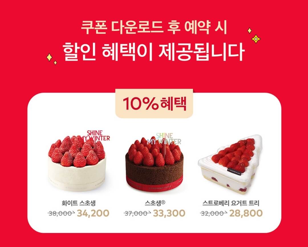 제가 맨 위에 걸어드린 투썸 케이크 할인 쿠폰 받기로 들어가면 10%, 15% 할인 쿠폰을 각각 다운로드할수있는데요~ 10% 할인 적용이 들어가는 상품으로는 화이트 스초생과, 스초생, 스트로베리 요거트 트리가 있어요.