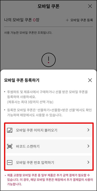 7. 요즘은 카카오톡 선물하기를 통해서 투썸 기프티콘 선물을 주고받기도 하는데요~ 투썸 기프티콘 사용은 주문정보 입력단계에서 진행하며 픽업 및 수령자 정보를 확인한 뒤 스크롤을 아래로 내려 모바일쿠폰영역에 있는 사용하기 버튼을 클릭하고, 오른쪽 위에 있는 모바일쿠폰 등록을 눌러 모바일 쿠폰 이미지 불러오기 또는 바코드 스캔, 모바일 쿠폰 번호 입력하기 중 하나를 선택하여 진행하면 돼요.